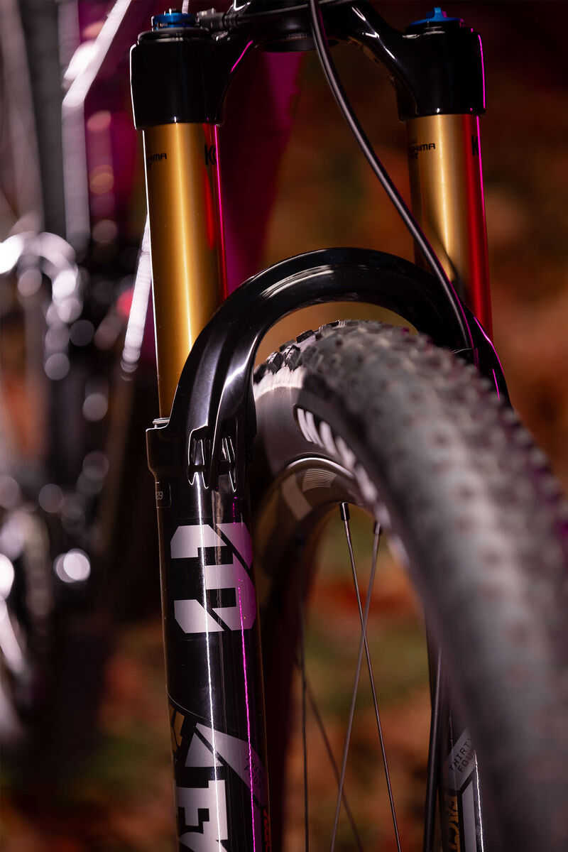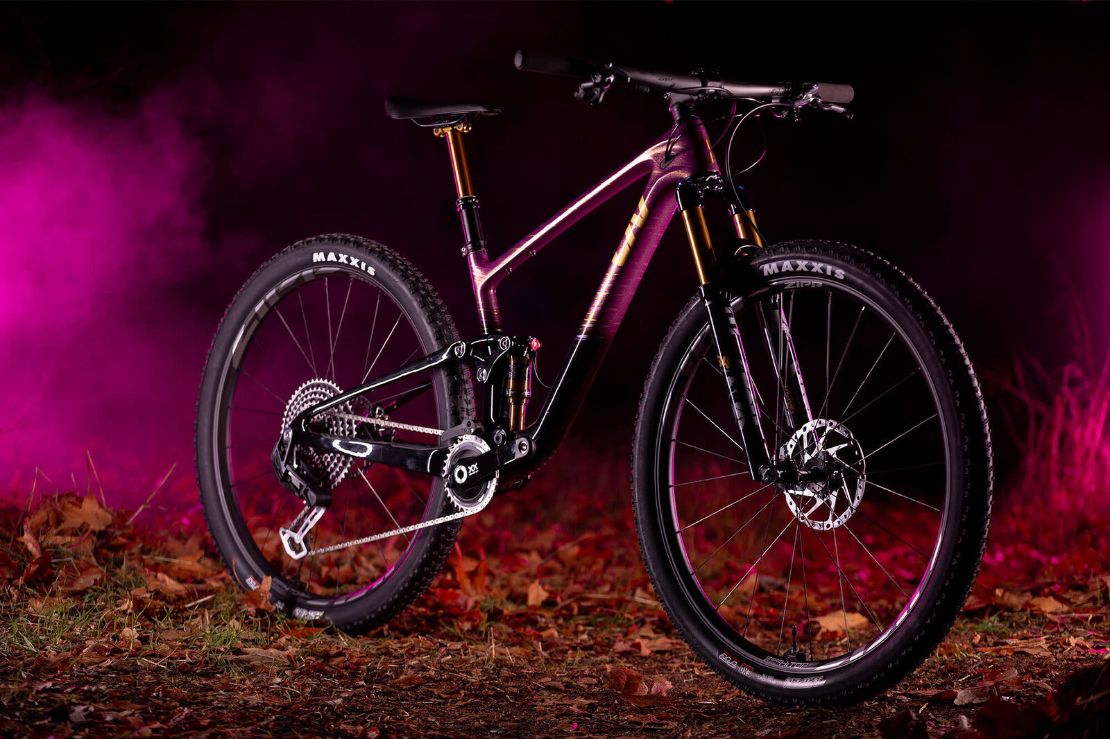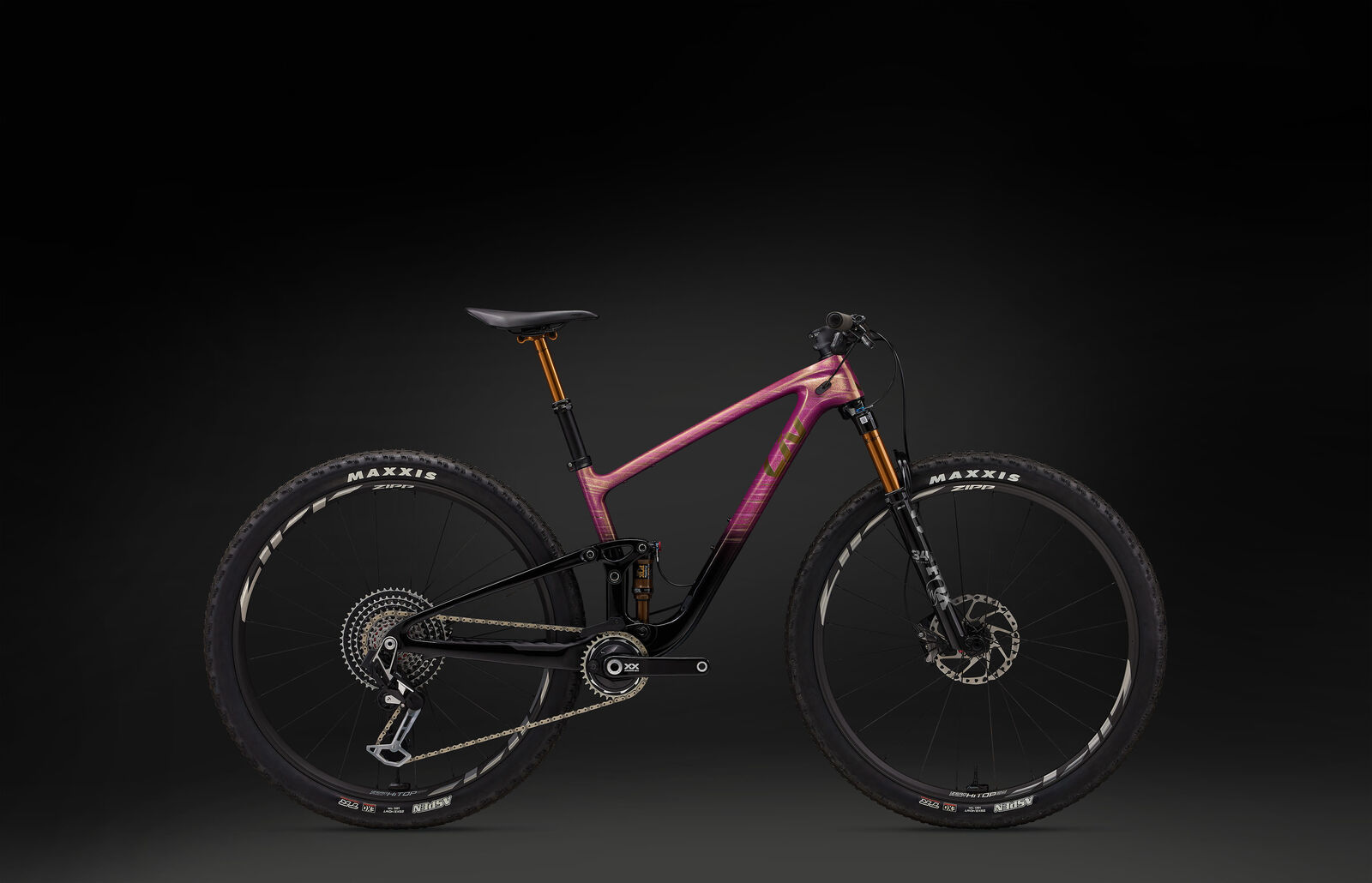 | Frame | Advanced-grade composite front and rear triangles, 115mm FlexPoint Pro Suspension Sizes S Colours Gloss Mulberry Glitter/Black/Chrome |