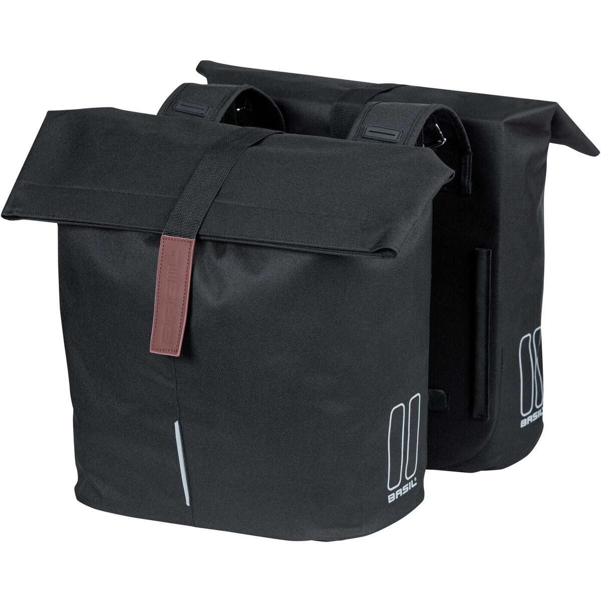Basil City - double bicycle bag - 28-32 liter - black The Basil City double pannier fits the tempo of the city: work, friends, going out, to the market or shopping. The bike bag is compact, not too big but still spacious enough with a capacity of 28 liters. If you need a little more room, then increase your capacity to 32 liters. The folding clasp with Velcro can be adjusted in height. The folding clasp also prevents rain.