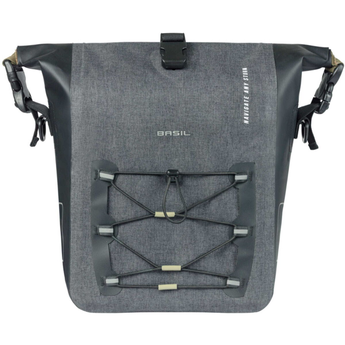 | Description | Navigator Storm Medium, single pannier bag,MIK Hooks, 12-15L, black The Basil Navigator Storm is a sporty bicycle bag with 12-15L capacity for the medium and 25-31L capacity for the large. The single bicycle bag in black is suitable for mounting on the back of a women's or men's bike and is easy to attach to your bicycle rack with the MIK Hooks system. With the Basil Navigator Storm bicycle bag, you choose a sporty and functional single bicycle bag. With this bag, you can tackle any adventure. 100% waterproof The bag is made of high-quality waterproof (IPX3) fabric. The functional design ensures that this bag can easily carry everything you need. Everything has been thought of to make it possible to take your belongings wherever you go in the most practical way. For example, there is room for a bicycle helmet thanks to the adjustable elastic cord. The bicycle bag can be easily closed with the roll-top closure. This roll-top closure can be attached in three ways. Traveling in the dark? No problem! With the reflective Basil logos on 3 sides, you'll be visible even then. Hence, you are always prepared for the road. Attaches effortlessly to your luggage carrier with MIK Hooks system. The removable shoulder strap allows you to turn this bicycle bag into a shoulder bag in no time Features: