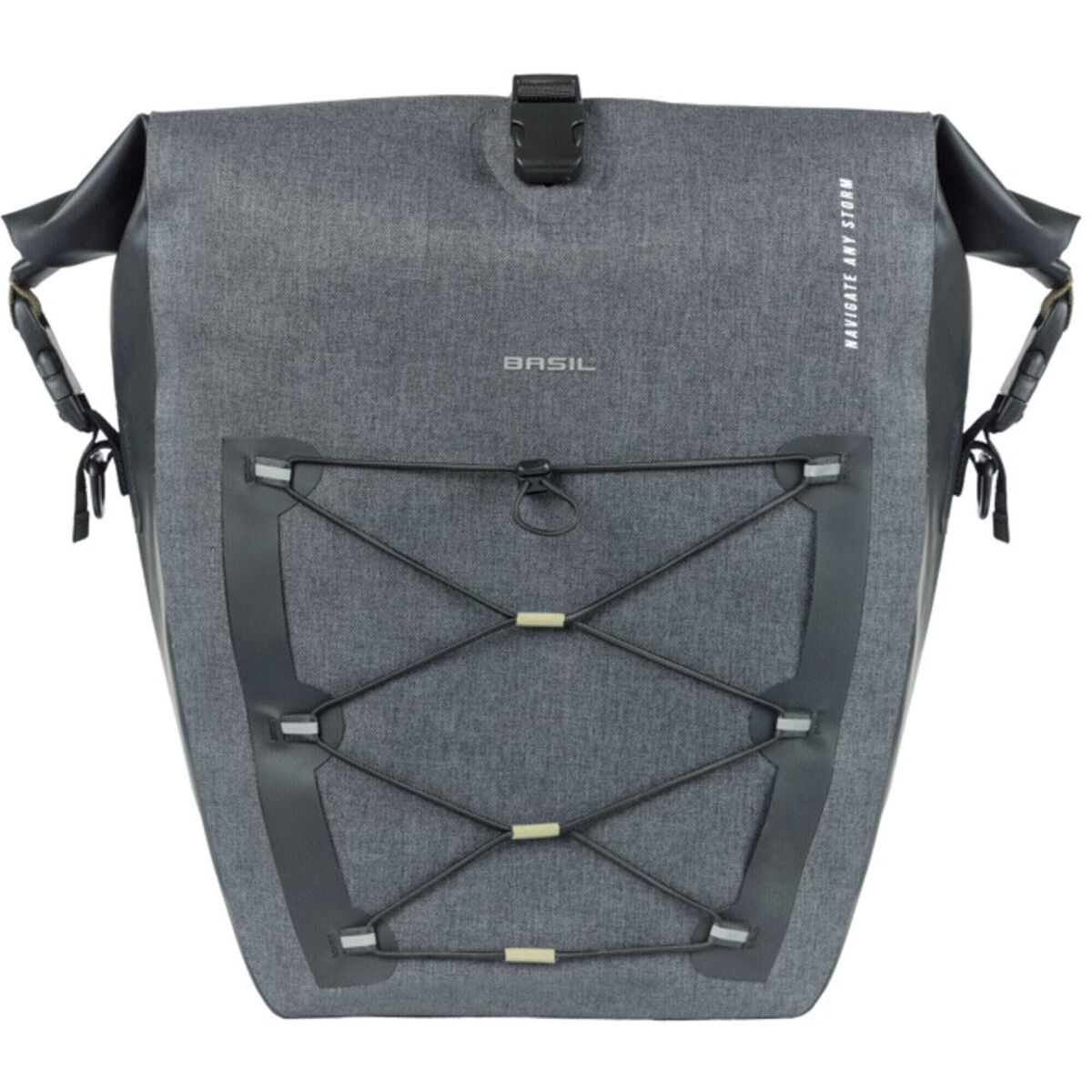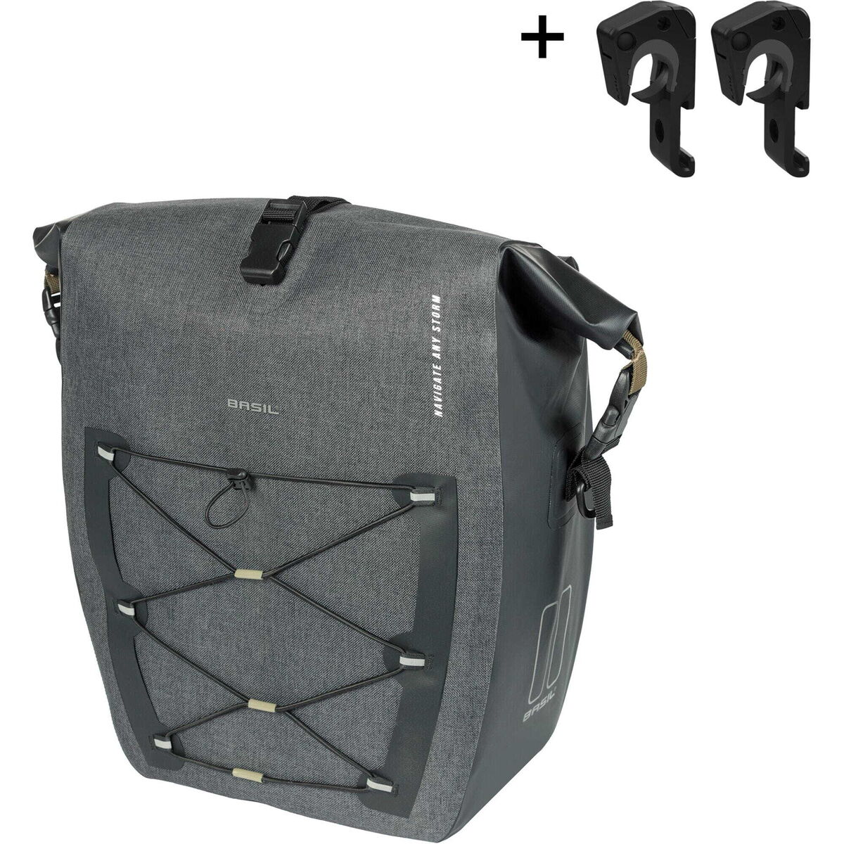 | Description | Navigator Storm Large, single pannier bag,MIK Hooks, 25-31L, black The Basil Navigator Storm is a sporty bicycle bag with 12-15L capacity for the medium and 25-31L capacity for the large. The single bicycle bag in black is suitable for mounting on the back of a women's or men's bike and is easy to attach to your bicycle rack with the MIK Hooks system. With the Basil Navigator Storm bicycle bag, you choose a sporty and functional single bicycle bag. With this bag, you can tackle any adventure. 100% waterproof The bag is made of high-quality waterproof (IPX3) fabric. The functional design ensures that this bag can easily carry everything you need. Everything has been thought of to make it possible to take your belongings wherever you go in the most practical way. For example, there is room for a bicycle helmet thanks to the adjustable elastic cord. The bicycle bag can be easily closed with the roll-top closure. This roll-top closure can be attached in three ways. Traveling in the dark? No problem! With the reflective Basil logos on 3 sides, you'll be visible even then. Hence, you are always prepared for the road. Attaches effortlessly to your luggage carrier with MIK Hooks system. The removable shoulder strap allows you to turn this bicycle bag into a shoulder bag in no time Features: