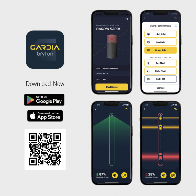 THE BRYTON GARDIA APP: Download the Bryton GARDIA app to unlock the full potential of your GARDIA R300L rearview radar and tail light. This official companion app allows you to not only view the status of approaching vehicles, but will emit audio notifications and vibrate when vehicles are coming. You can also control the GARDIA R300Lâ€TMs tail light directly from the app to easily configure your preferences as well as receive the latest firmware updates.