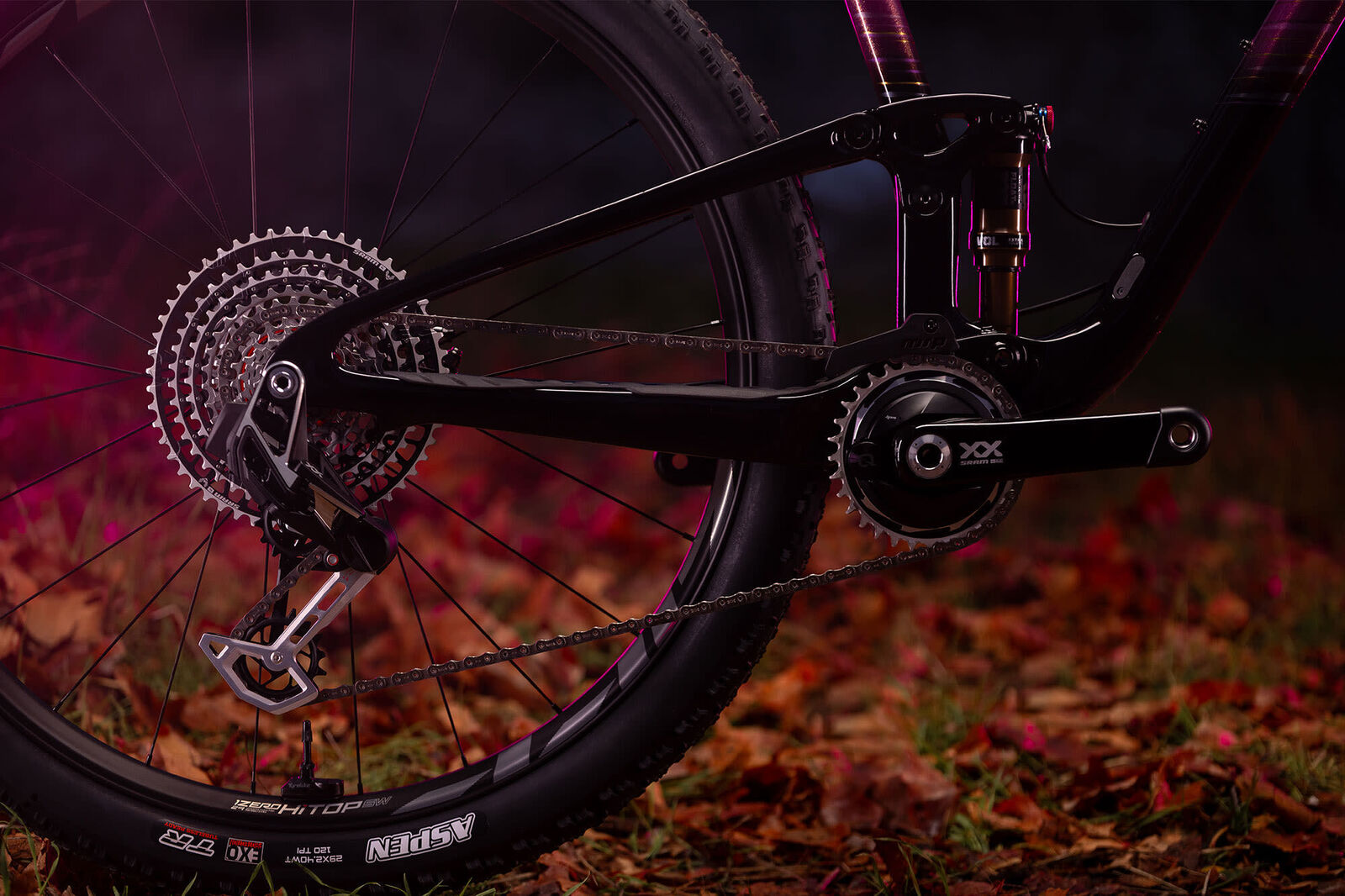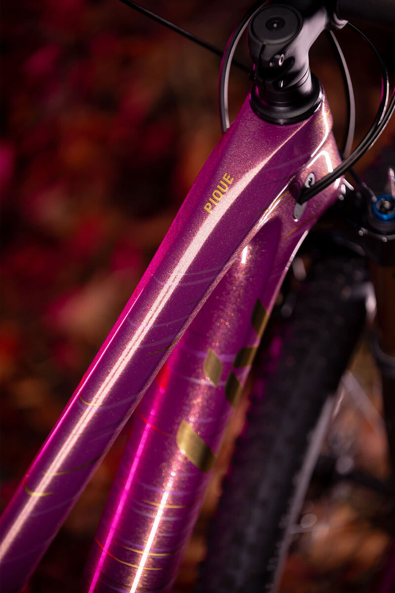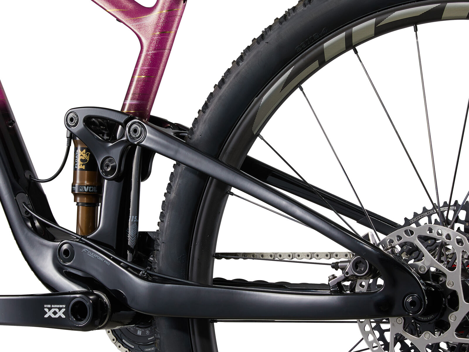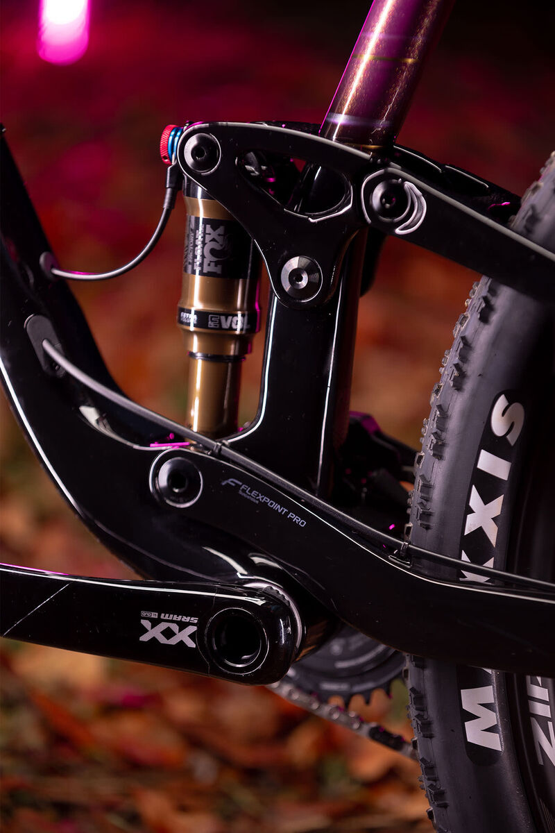 | Frame | Advanced-grade composite front and rear triangles, 115mm FlexPoint Pro Suspension Sizes S Colours Gloss Mulberry Glitter/Black/Chrome |