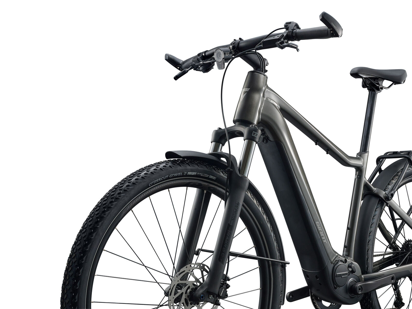 | Style | Built for adventure, the Explore E+ turns commutes and escapes into open horizons. With versatile design and seamless integration, it delivers smooth support, confidence, and freedom to ride farther-wherever the journey leads.Specifications:Motor Giant SyncDrive Sport2, 75Nm PedalPlus 6-sensor technologyController Giant RideControl Dash 2, Smart Assist automatic mode, 5 support levels Display Giant RideControl Dash 2 high-angle visibility, full color LCD display Battery Giant EnergyPak Smart 500Wh, Aluminium casing with highest safety standard (EN50604), CO2 Neutral production Charger Giant EnergyPak 4A smart charger compact, 60% charge in 2:30h Connectivity Giant RideControl App enabled ANT+ wireless display signal with e-bike profile Sizes M, L, XL Colours Stealth Chome, Mars Dust Frame Gen 3 ALUXX aluminum, Overdrive 1.8" - 1.5" head tube, integrated battery, integrated KSA40 kickstand mount Fork SR Suntour XCM34 Boost DS 100mm travel 15AH4-110 axle Shock n/a Handlebar Giant Connect Riser 31.8x690mm Grips Giant Contact Stem Giant Contour integrated 16a?degree (S/M:80mm L/XL/XXL 100mm) Seatpost Giant 30.9mm, 2-bolt Micro Adjustable, Forged Aluminium Saddle Selle Royal Vivo Ergo Moderate Unisex Pedals Anti-slip Platform Pedal Shifters Shimano Cues Rear Derailleur Shimano Cues 9-speed Brakes Tektro HD-M280, hydraulic disc, 180mm Brake Levers Tektro HD-M280 Cassette Shimano Cues, 11-36T, 9-speed Chain Shimano Linkglide CN-LG500 Crankset Forged alloy spider w/chainguard BCD 104, steel narrow/wide chainring 46T Rims Giant GX03V, 622x21 Aluminium Hubs Giant eTracker Boost 6-bolt disc 15x110mm [F] 12x148mm [R] Spokes Stainless steel, e-bike optimized Tyres Crosscut Gravel 2, 700x57c, Wire Bead, Tubeless Ready,w/ Reflection Strip Extras HMI 2.0 including E locking and Apple Find My Lighting Recon E HL50 StVZO [F] AXA NYX 6-12V E-bike tail light [R] Lock ABUS Xplus battery lock Carrier MIK rack. System bag & basket compatible Fender/Chainguard Alluminum Combined Maximum Load Limit Type 3 150kg |