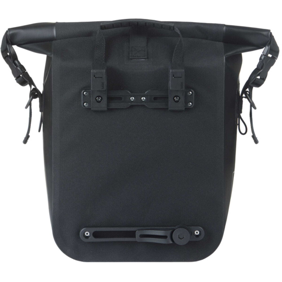 The bag is closed with a roll-top closure. The closure can be rolled two ways: to the back of the bag or on top of the bag. You can use the snap fasteners flexibly. Whatever you prefer! With MIK Hooks, you can easily attach the bag to your rack with one swift motion – and just as easily detach it. You can also attach the bag to the bicycle frame with the adjustable hook at the bottom of the bag